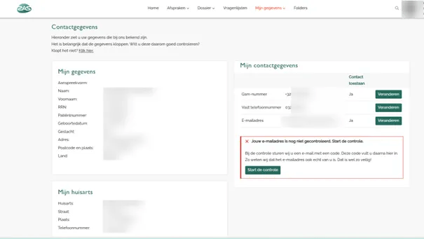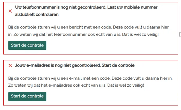 Wanneer je een gsm-nummer of emailadres invult of verandert, kan je dat laten verifiëren om zeker te zijn dat je de juiste gegevens hebt ingevuld. Klik bij het toepasselijke contactgegeven op ‘Start de controle’ en wacht tot je een sms of e-mail krijgt met verificatiecode.