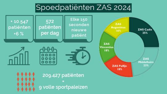 Het aantal patiënten op spoeddiensten stijgt al jaren. Dat komt door o.a. het dalend aantal huisartsenuren en de verschuiving van opnames in het ziekenhuis naar het dagziekenhuis. Om het toenemend aantal spoedpatiënten de nodige zorg te kunnen bieden, werkt ZAS met een combinatie van spoeddiensten en eerstehulpcentra die focussen op kleinere letsels.