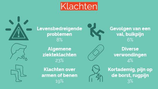 Algemene ziekteklachten, zoals hoofdpijn en een verstopte neus, zijn goed voor bijna een kwart (23%) van de aanmeldingen. Met 19 procent staan klachten over armen of benen op de tweede plaats. De gevolgen van een val en buikpijn zitten elk rond de zes procent. Verderop volgen diverse soorten verwondingen (4%), kortademigheid, pijn op de borst en rugpijn (elk 3%).