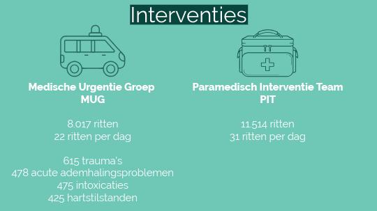 De MUG’s en PIT’s van ZAS rukten vorig jaar respectievelijk 8.017 en 11.514 keer uit, samen 19.531 interventies. Voor de MUG’s zijn dat gemiddeld 22 ritten per dag, voor de PIT’s 31 ritten per dag. Een MUG heeft naast een ambulancier en spoedverpleegkundige ook een urgentiearts en meer uitrusting aan boord.